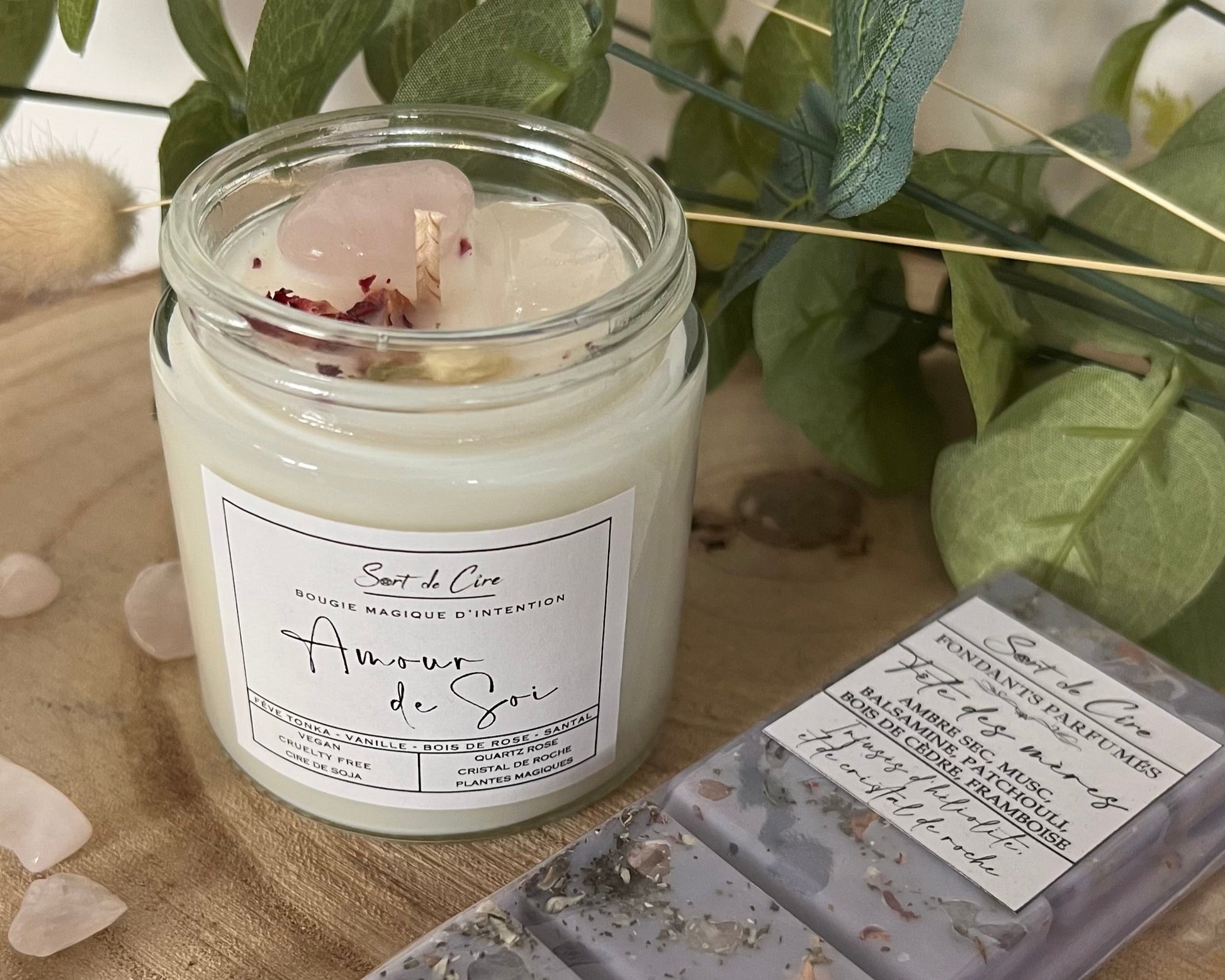 De la cire végétale, des fragrances de Grasse, des minéraux naturels, des plantes magiques et beaucoup de magie.