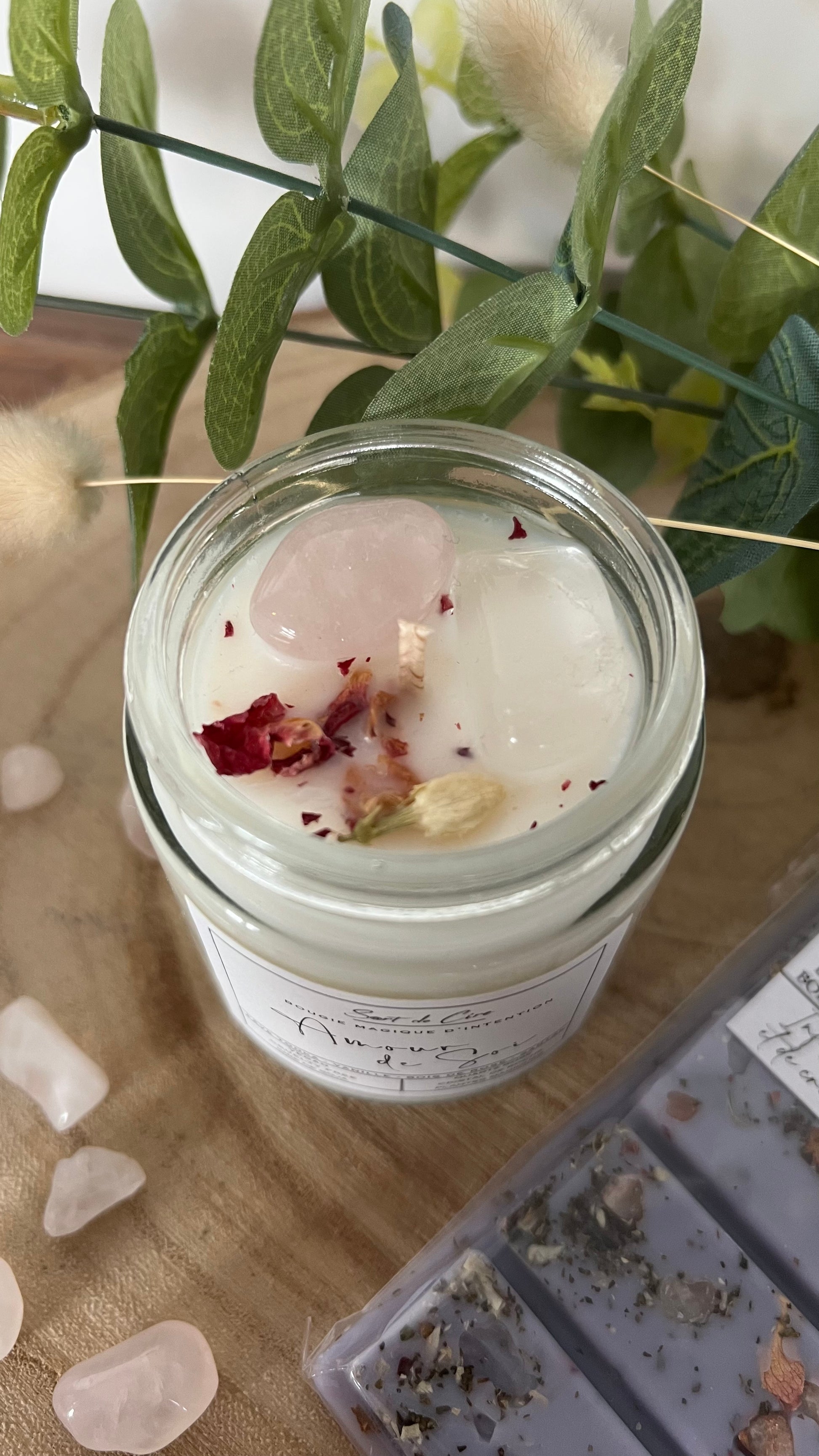 Composition la bougie amour de soi : De la cire végétale, des fragrances de Grasse, des minéraux naturels, des plantes magiques et beaucoup de magie.